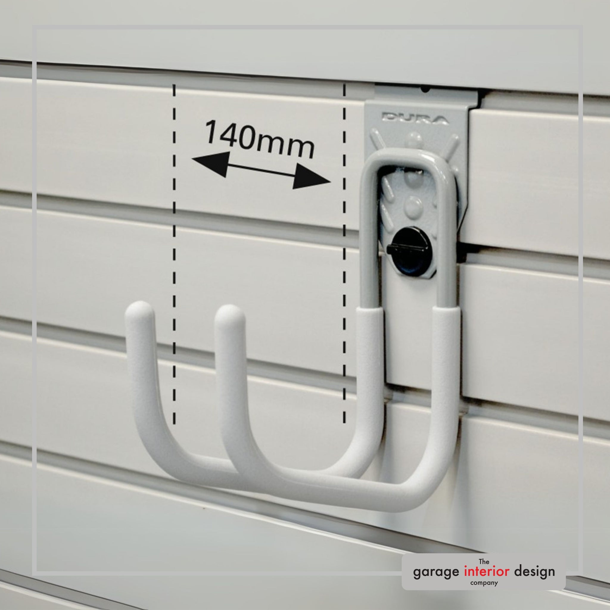 The heavy-duty cradle hook is another hook for larger or bulkier items. It serves a similar function to the heavy-duty utility hook (DUAS-005), and is an alternative option for large items that require a hook capable of taking a heavier load or a wider base to spread the weight. The curved double prongs at the front point create an upstand to make sure these heavier items remain securely in place. 140mm (arm length)